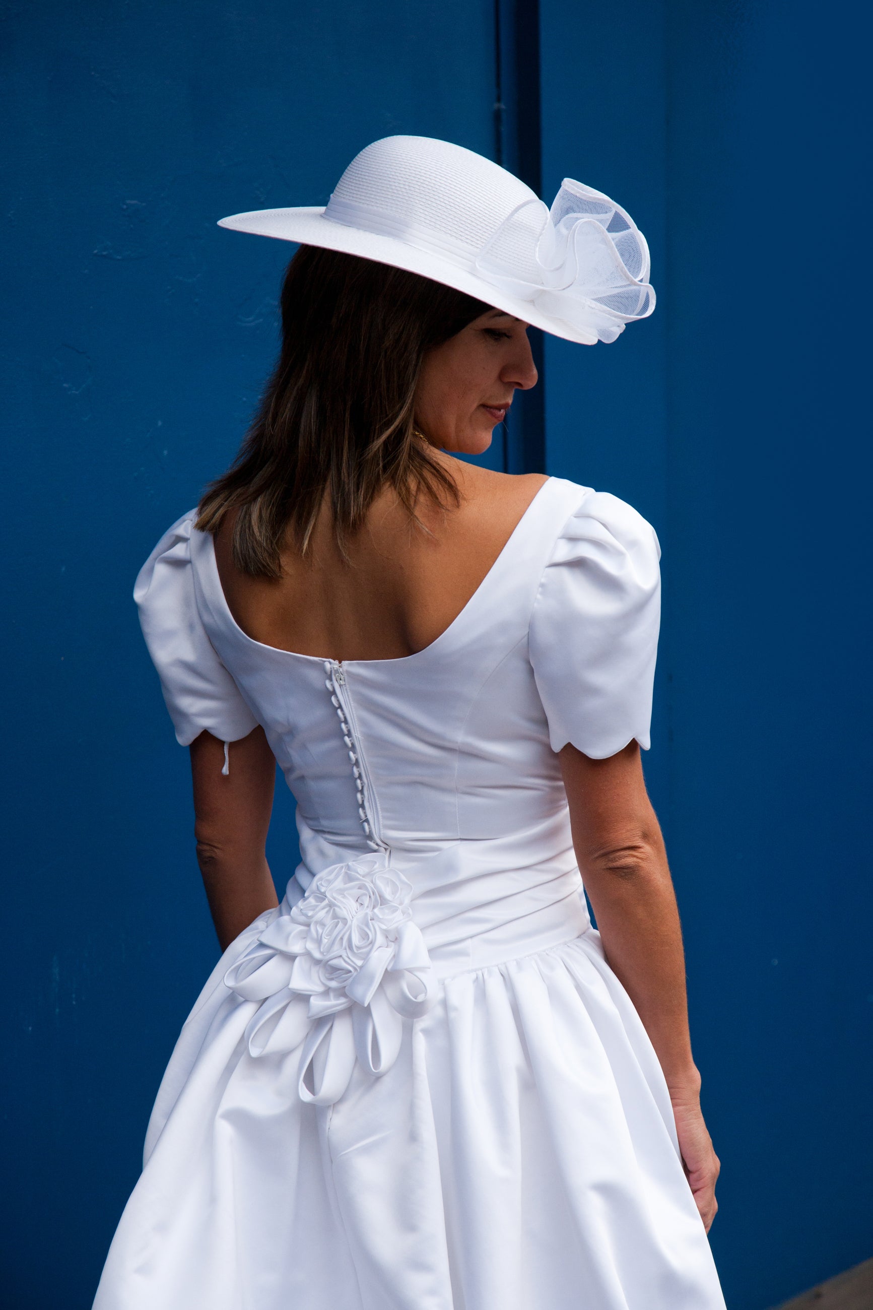 The City Chic gown in white satin offers a refined silhouette with its fitted waist and flowing full-length skirt. Its classic scalloped sleeves enhance the delicate neckline, creating an elegant and timeless look. This gown redefines sophistication, making white appear effortlessly classy.