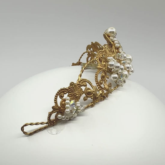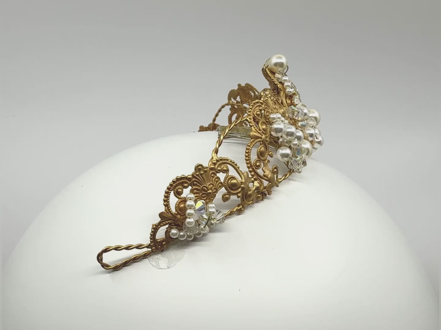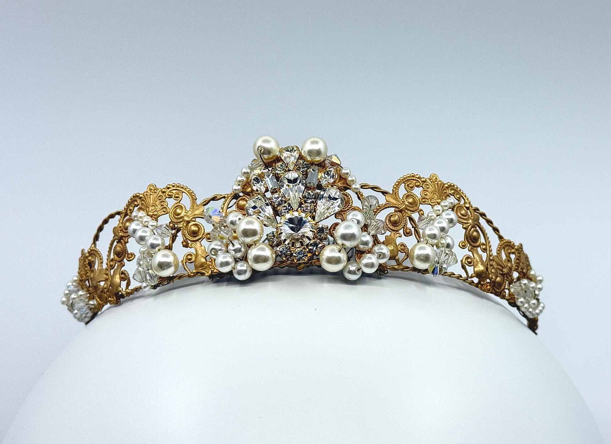 Elevate your style with our Golden Clouds tiara, a masterful blend of lustrous pearls, shimmering sparkles, and elegant gold swirls. This exquisite piece is designed to captivate attention and add a refined touch to any ensemble, showcasing expert craftsmanship and timeless sophistication.