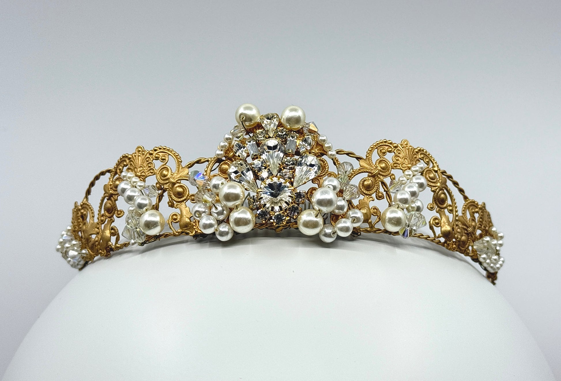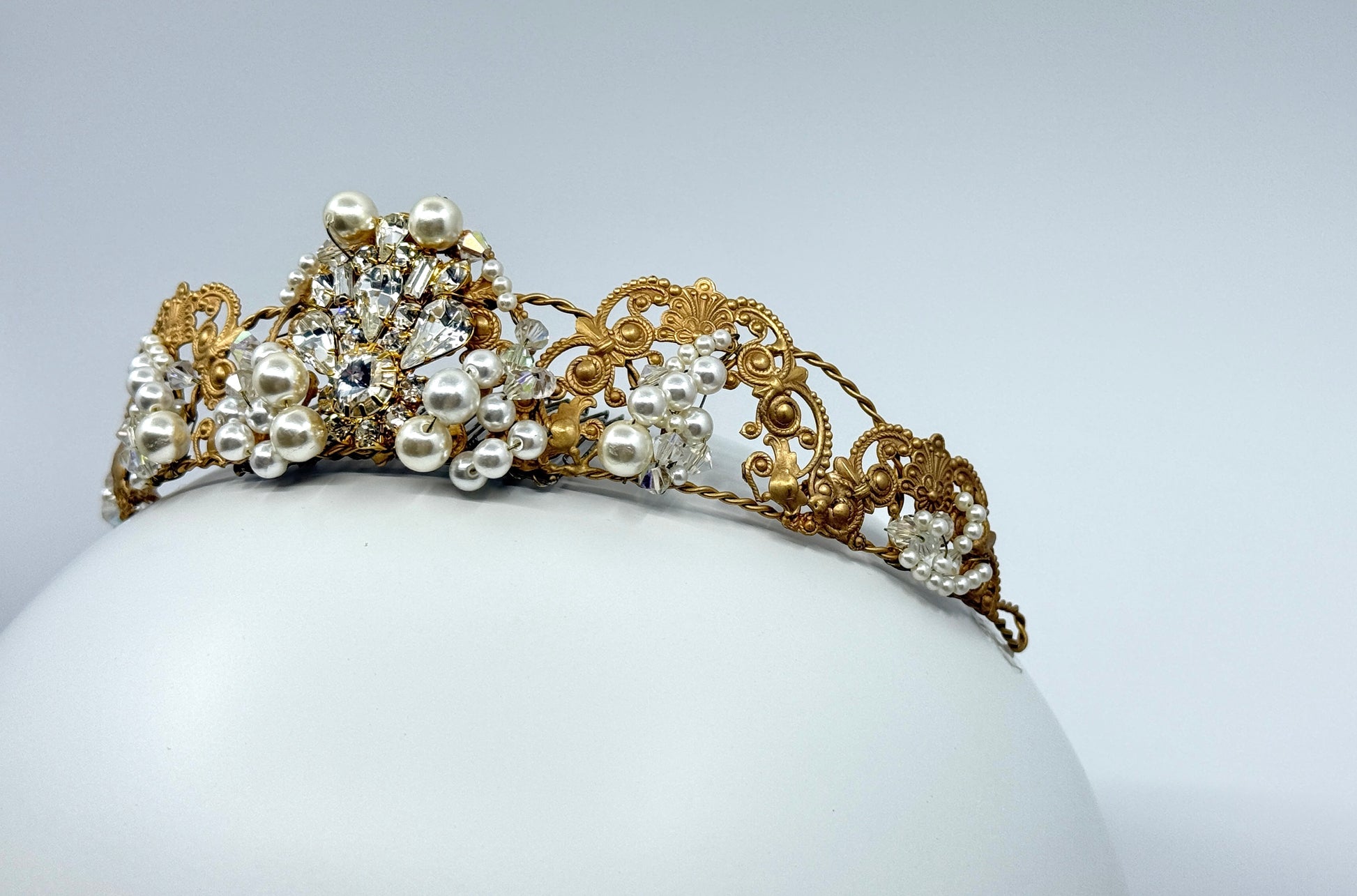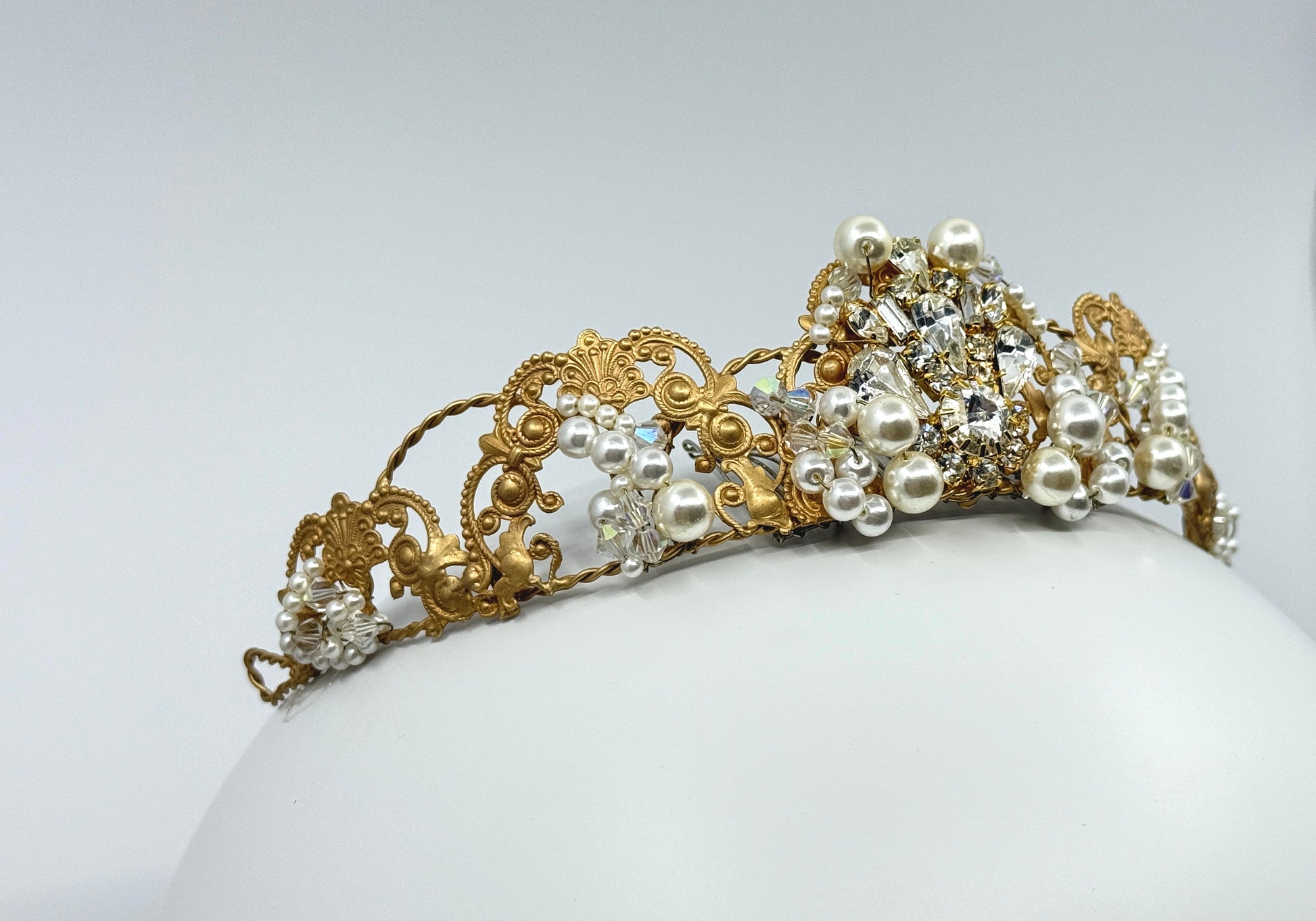 Elevate your style with our Golden Clouds tiara, a masterful blend of lustrous pearls, shimmering sparkles, and elegant gold swirls. This exquisite piece is designed to captivate attention and add a refined touch to any ensemble, showcasing expert craftsmanship and timeless sophistication.