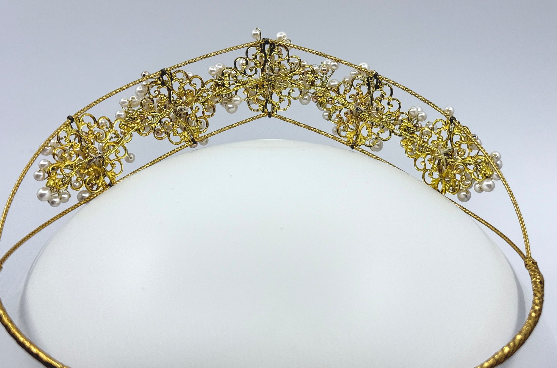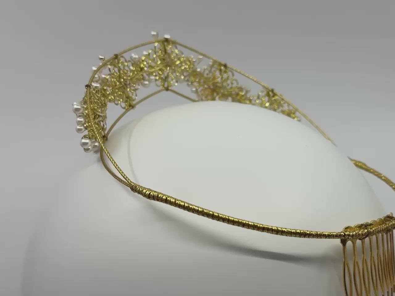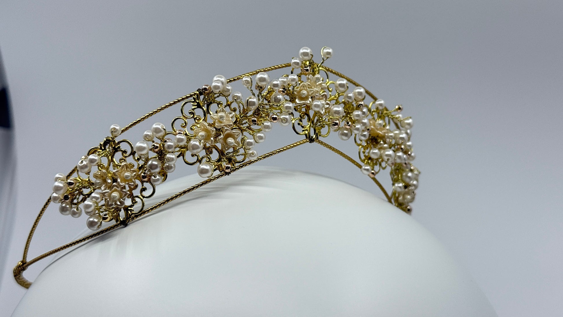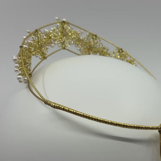 Elevate your bridal look with The Regal One tiara, expertly crafted with lustrous pearls, delicate flower motifs, and intricate golden swirls. This exquisite piece combines timeless elegance with refined artistry, making it the perfect crown to complement your special day with sophistication and grace.